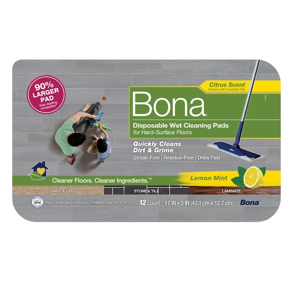 Bona Hard-surface Floor Wet Disposable Cleaning Pads, Lemon Mint Scent, (12-Count)