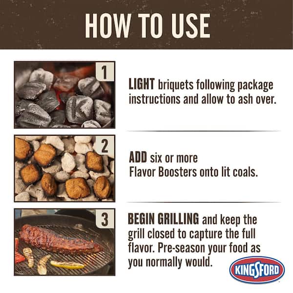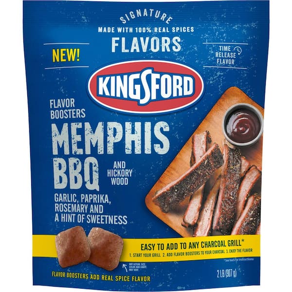 Memphis BBQ enhances the rich character of Hickory smoke with sharp notes of paprika and garlic, adding to your food an indulgent finish of caramel aromatics with a hint of herbal notes. These made-for-the-grill classics team up to elevate your favorite foods to new flavor heights. Kingsford Signature Flavors Flavor Boosters are easy to add to any charcoal grill* – just start your grill, add flavor boosters to your charcoal and enjoy. The 100% real spice flavor pairs well with ribs, beef, chicken, pork, lamb and vegetables. Place 6 or more Kingsford Signature Flavor Boosters onto lit coals and replace grill grate. To increase smoke intensity, use additional flavor boosters. Add food and keep grill closed to maximize flavor. Season your food with your favorite spices as you normally would. Elevate your everyday grilling with Kingsford Signature Flavors Memphis BBQ Flavor Boosters. *See back of pack for instructions.