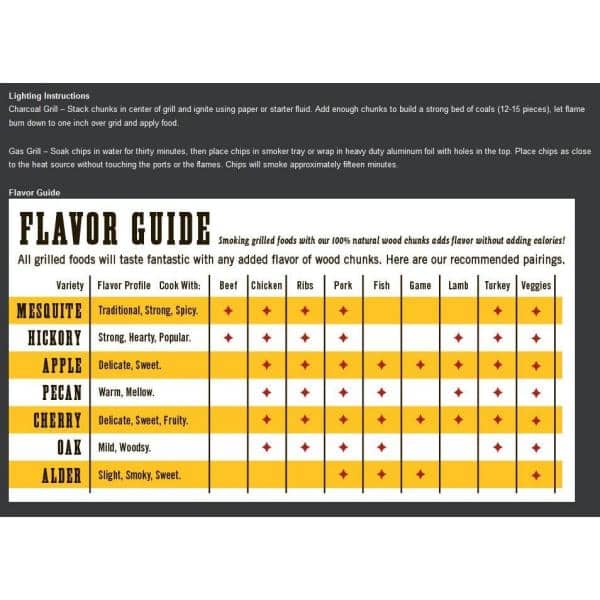 Todays more natural lifestyles embrace fresh, healthful foods and low- calorie cooking. Our wood products are a 100% natural fuel source that contains no chemicals, additives or preservatives. Our wood eliminates any added calories or fat, but doesn’t compromise an ounce of flavor. Use our natural wood chunks to compliment charcoal grilling. Allow your meal to absorb the tantalizing smoke that creates a flavor in the food that will send your taste-buds racing. Barbecue with 100% all natural hardwood and bring the best to your table. The Hickory Wood Chunks are the best way to achieve a perfect smokehouse hickory flavor. Real hickory wood creates a sweet smoke flavor, perfect for barbecue. Authentic natural hickory enhances the flavors of poultry, pork and beef.