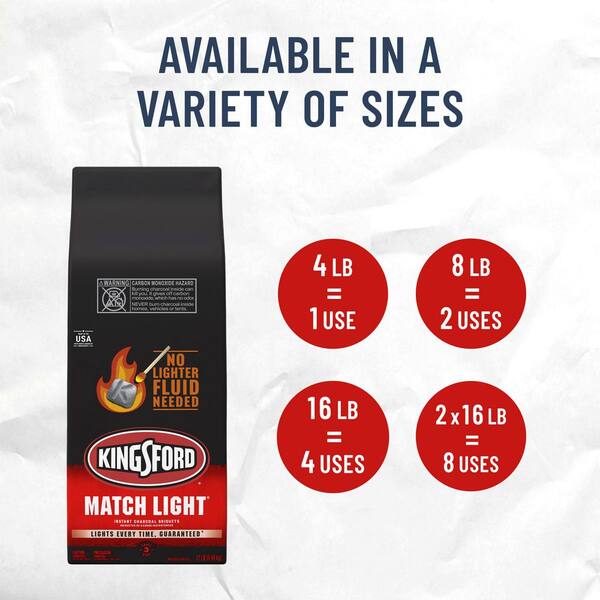 Add more sizzle to your BBQ with Kingsford Match Light Instant Charcoal Briquettes, no lighter fluid needed. These grilling briquettes are Kingsford’s fastest lighting charcoal and are ready in about 10-minutes. Each charcoal briquette contains just the right amount of lighter fluid and features Sure Fire Grooves which have more edges for fast lighting. Perfect for grilling with large groups, these charcoal briquettes are an easy way to make a meal an event. Choose Kingsford Match Light Charcoal for your next cookout. Because taste is everything. This bag of 8 lbs. equals about 2 uses. Scan the QR code on the pack to unlock grilling tips, techniques and more. *When used as directed.