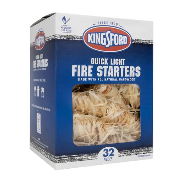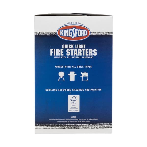 Light your charcoal & firewood with ease using Kingsford Quick Light Fire Starters. These expertly crafted fire starters are made of all natural hardwood and can burn for up to 10 minutes. They are water resistant, easy to light & compatible with all grill types making them ideal for grilling, campfires & outdoor fireplaces. Directions: For use with charcoal chimney starter: Step 1: Place one fire starter under the vented charcoal chimney starter base on a safe, flat surface. Step 2: with a Kingsford long reach lighter or match, light the fire Starter & allow charcoals to ash over prior to spreading over grilling surface. For use with charcoal mound or firewood: Step 1: Place 2-3 starters evenly throughout mounded charcoal or into the inner ring of firewood logs. Step 2: with a Kingsford long reach lighter or match, light the fire starters. Caution: Windy weather can disperse lit embers which can cause unintended fires. Use in a dry, safe & well ventilated area where temperatures do not exceed 110AÃ,° Fahrenheit. Do not add if fire or coals are hot, leave unattended, or breath fumes. Grill liners from Kingsford grilling include veggie grillers, fish grillers, meat grill liners, and so many other types of grilling liners. Foil products like Kingsford foil grilling products are strong, durable, heavy duty, and great grill accessories. There are even charcoal smoker accessories that make great grill sets for men.