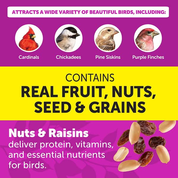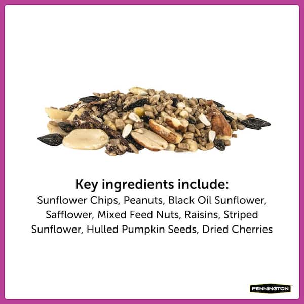 Pennington Ultimate Nut and Fruit Bird Seed Blend attracts a wide variety of beautiful songbirds to your feeders. This appealing, premium mix of healthful seeds, grains, nuts and fruit pieces is fortified with nutrients, which include sunflower chips, black oil sunflower, safflower seed and more. This high energy bird food blend is ideal for year-round bird feeding.