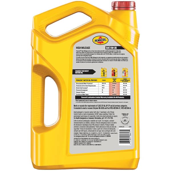 Pennzoil High Mileage Synthetic Blend Motor Oil is designed for engines with more than 75,000 miles, specially formulated to help stop leaks from seals and reduce the oil consumption that is typical of older, worn engines. Severe oil consumption and oil burn-off may also cause other issues, leaving deposits on the internal parts of your engine. Pennzoil High Mileage Motor Oil also helps prevent dirt and sludge from turning into performance-robbing deposits. Pennzoil High Mileage motor oil comes with a warranty coverage of up to 10 years or 300,000 miles, whichever comes first. (Pennzoil Motor Oil Lubrication Limited Warranty: Up to 10-years or 300,000 miles, whichever comes first, if you exclusively use Pennzoil motor oil, Pennzoil Professional motor oil, Pennzoil Gold Synthetic Blend motor oil, Pennzoil High Mileage motor oil, Pennzoil High Mileage Full Synthetic motor oil, or Pennzoil Full Synthetic motor oil. Your engine must have fewer than 125,000 miles and have been manufactured in the past 72-months. To maintain your warranty, change your vehicle’s oil and oil filter at least as often as recommended by the vehicle manufacturer. Enrollment required. Keep your receipts. Other conditions apply. See pennzoil.com/warranty to enroll and for full details and terms.)