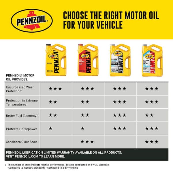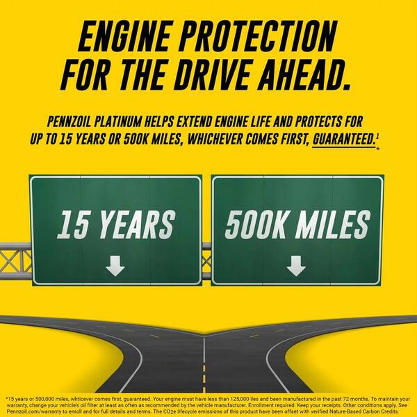 Pennzoil Platinum Full Synthetic is designed to maximize engine protection and is backed by a 15,000-mile protection guarantee (see Warranty Information below) to protect your pursuit of every mile. Made with natural gas, it is formulated for complete protection for top engine performance. Pennzoil Platinum offers cleaner pistons (based on Sequence IIIH results), helps protect engines from loss of power, delivers better fuel economy (based on the latest industry standard), provides unsurpassed wear protection (based on Sequence IVA wear test using SAE 5W-30), and provides excellent performance in extreme temperatures. (Pennzoil Platinum Lubrication Limited Warranty: Protection for up to 15,000 miles or 1-year, whichever comes first. Use an oil filter designed for longer oil change intervals and follow OEM manual and vehicle’s oil life sensor to maintain OEM warranty. Excludes severe driving conditions, including racing and commercial use. Your engine must have fewer than 125,000 miles and have been manufactured in the past 72-months. Enrollment required. Other conditions apply. See pennzoil.com/warranty to enroll and for full details and terms.)
