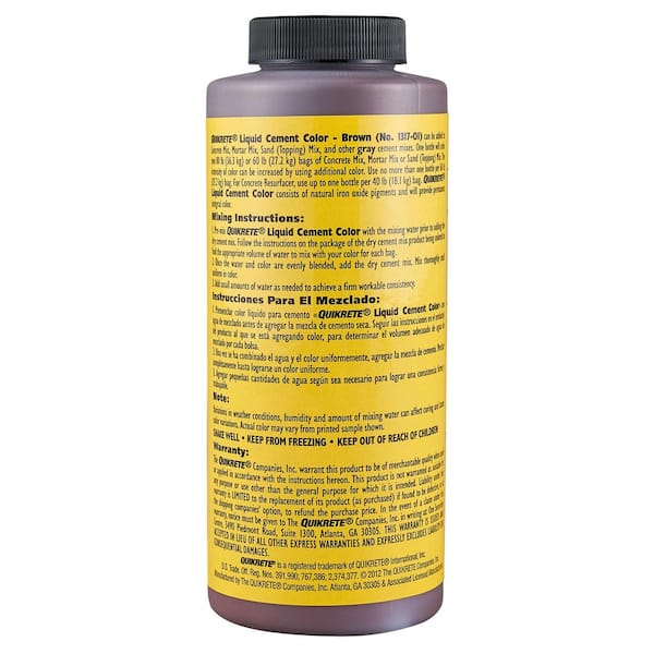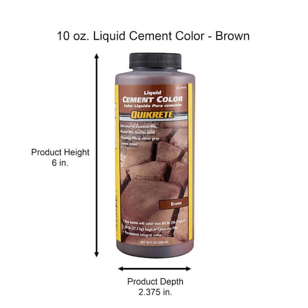 Quikrete 10 oz. Liquid Cement Color – Brown is used to enhance your cement based projects. Easy to use by mixing with water, then mixing into the dry mix, this color can also be added to stucco, sand topping and mortar. Quikrete 10 oz. Liquid Cement Color – Brown is integrated into the cement mix when used as directed, so the color will never fade away from your decorative projects.