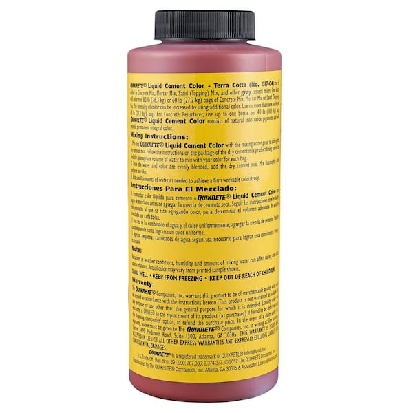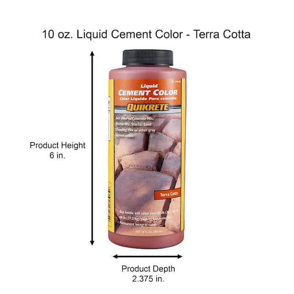 Quikrete 10 oz. Liquid Cement Color – Terra Cotta is used to enhance your cement based projects. Easy to use by mixing with water, then mixing into the dry mix, this color can also be added to stucco, sand topping and mortar. Quikrete 10 oz. Liquid Cement Color – Terra Cotta is integrated into the cement mix when used as directed, so the color will never fade away from your decorative projects.