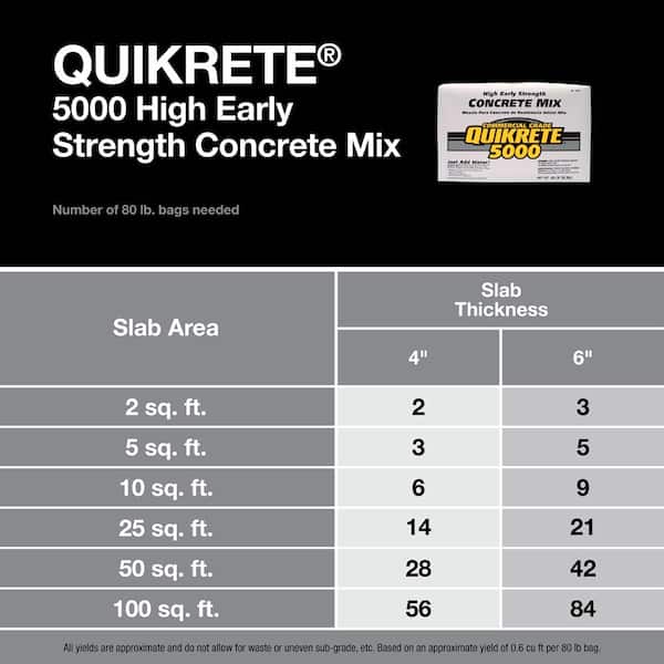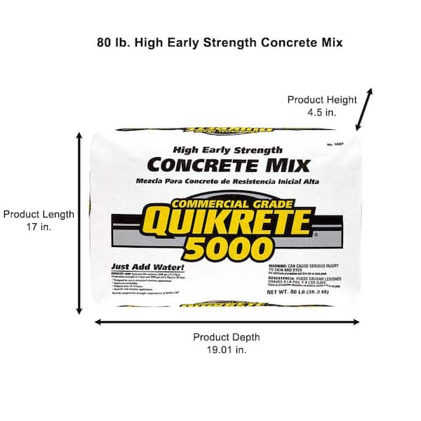 Quikrete 80 lb. 5000 High Early Strength Concrete Mix consists of a commercial grade blend of Portland cement, sand, gravel. This concrete mix is designed for applications requiring high early strength and rapid strength gains. Quikrete 80 lb. 5000 High Early Strength Concrete Mix has a walk on time of 10-12 hours. It is a perfect mix for both the DIY’er and contractor that are looking for a concrete with rapid strength gain.