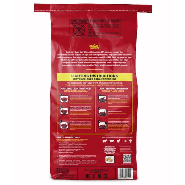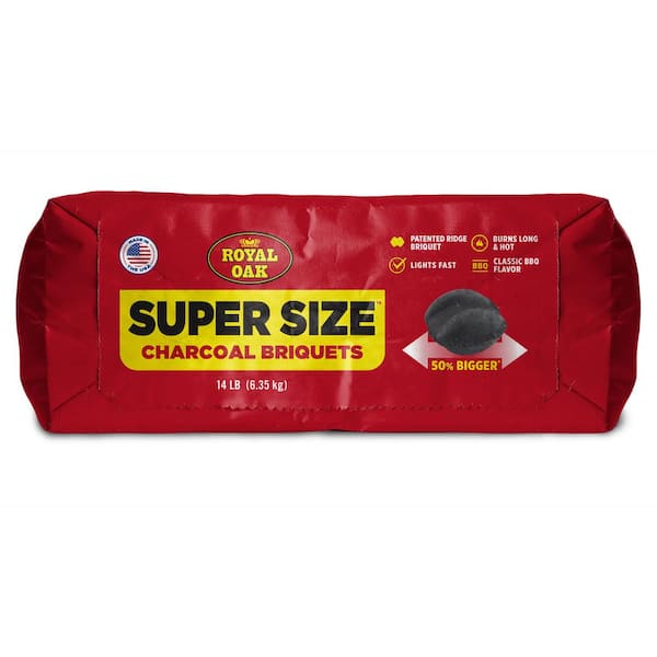 Super Size Charcoal Briquets are Royal Oak’s biggest ridge briquet! Super Size briquets light fast, with high heat and a long burn time for the ultimate grilling experience. Give your food that classic smoky, wood-fired BBQ flavor you know and love. Made in the USA from the finest hardwoods and featuring our patented fast-start ridge design for superior air flow and consistent temperatures. Perfect for grilling at high temperatures and for low & slow smoking. Works great in charcoal grills and smokers.