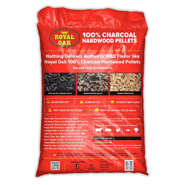 Royal Oak 100% Charcoal Hardwood Pellets gives your food that classic smoky, wood-fired BBQ flavor you know and love. We took the lessons we learned from decades of producing Royal Oak Hardwood Lump Charcoal and brought them to your pellet grill. Now you can enjoy the authentic BBQ flavor that only charcoal can provide. These pellets are water resistant so don’t worry about anymore clogged augers from regular wood pellets again. Our charcoal pellets burn hotter to sear in flavor and with less ash. Perfect for grilling at high temperatures and for low & slow smoking at consistent temperatures. Safe to use in all pellet grills including Traeger, Pit Boss, Weber, Camp Chef, RecTeq and Green Mountain Grills.