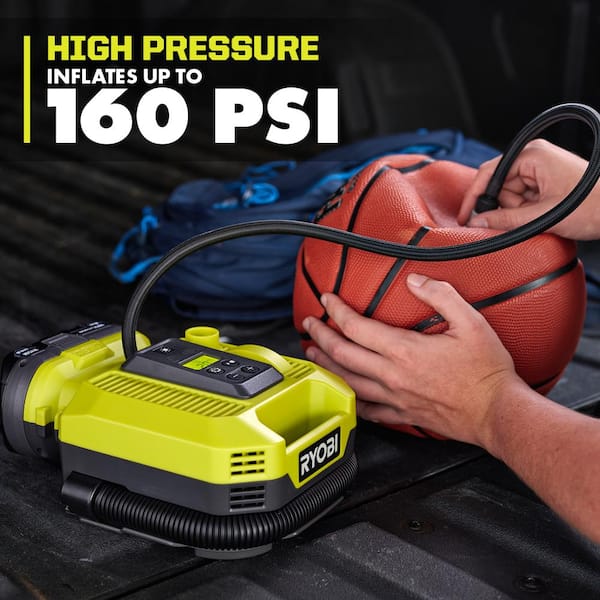 The RYOBI 18V ONE+ Dual Function Digital Inflator is ideal for a variety of applications ranging from filling tires/sports balls to inflation and deflation of air mattresses and pool toys. The high pressure inflation of up to 160 PSI and high volume inflation up to 16 SCFM ensure quicker and more efficient inflation. Filling tires is easier than ever with auto shut-off and the quick-connect air chuck for hands-free use. A digital pressure gauge provides clear and accurate measurement readings and the bright LED worklight allows for clear visibility no matter the environment. Take this inflator anywhere with the integrated carry handle and on-board accessory storage. Best of all, it is part of the RYOBI ONE+ System – Any 18V ONE+ Battery Works With Any 18V ONE+ Product. This 18V ONE+ Dual Function Digital Inflator/Deflator is backed by the RYOBI 3-Year Manufacturer’s Warranty and includes PCL031 18V ONE+ Dual Function Digital Inflator/Deflator, Sports Needle, Presta Valve Adaptor, Pinch Valve Adaptor and Operator’s Manual. Battery and charger sold separately.