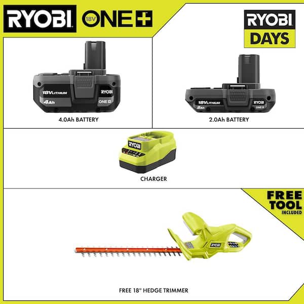 RYOBI ONE+ 18V Lithium-Ion Starter Kit with 2.0 Ah Battery, 4.0 Ah Battery, Charger, and FREE ONE+ 18” Cordless Hedge Trimmer PSK106SB-P2607BTL