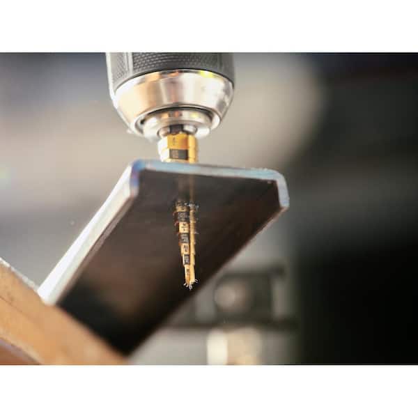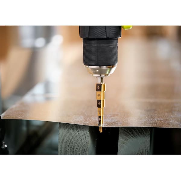 Complement your drilling solutions with the RYOBI 3 PC. Step Drill Bit Set, designed to produce burr-free holes in thin metals and plastics, ideal for drilling and enlarging holes. Each step drill bit allows you to drill a range of different size holes to a specific diameter, eliminating the need for multiple individual drill bits-improving efficiency on every project. The titanium coating provides faster drilling while reducing heat for durability and extended life. Featuring a double straight flute design, these bits deliver smooth and professional finishes for ultimate control in a drill. Laser etched size markings make it easy to identify sizes, even after repeated use. Additionally, the high visibility step marking bands provide clear reference while drilling, so you’ll always know when to stop at your desired size. The 140° split point tip prevents bits from walking and allows you to engage instantly with the material for a quick startup. The 1/4″ hex shank ensures a secure grip in drill chucks while also enabling use in impact drivers. This 3 PC. Step Drill Bit Set includes #6 Step Bit ranging from 3/16″ to 1/2″, a #12 step drill bit ranging from 3/16″ to 7/8″ and #13 step drill bit ranging from 1/8″ to 1/2″.