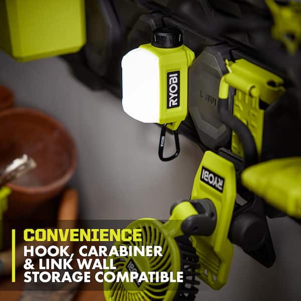 The RYOBI USB Lithium LED Compact Area Light Kit provides illumination in a durable and space saving design. With up to 300 Lumens, this compact area light can easily light up any environment hands-free with folding metal hanging hook, included carabiner and RYOBI LINK Wall Storage compatibility. Never be left in the dark in emergency situations with 52 hours of continuous runtime using the included USB Lithium 2Ah Battery on low. The IP54 dust and water resistance rating ensure this light is a reliable solution built to withstand even the toughest conditions. The included USB Lithium 2Ah battery features a USB-C port that also charges mobile devices, and a LED fuel gauge that clearly indicates the battery level status with the press of a button, eliminating guess work. The product also features an LED indicator to signal when the battery is charged (green) or has low battery (red) while in-use. Best of all, it is part of the RYOBI USB Lithium System of tools that provides compact, rechargeable, everyday solutions for cordless power and productivity. This USB Lithium LED Compact Area Light Kit is backed by the RYOBI 2-Year Manufacturer’s Warranty and includes FVL59 LED Compact Area Light, USB Lithium 2Ah Battery, USB Cable and Operator’s Manual.
