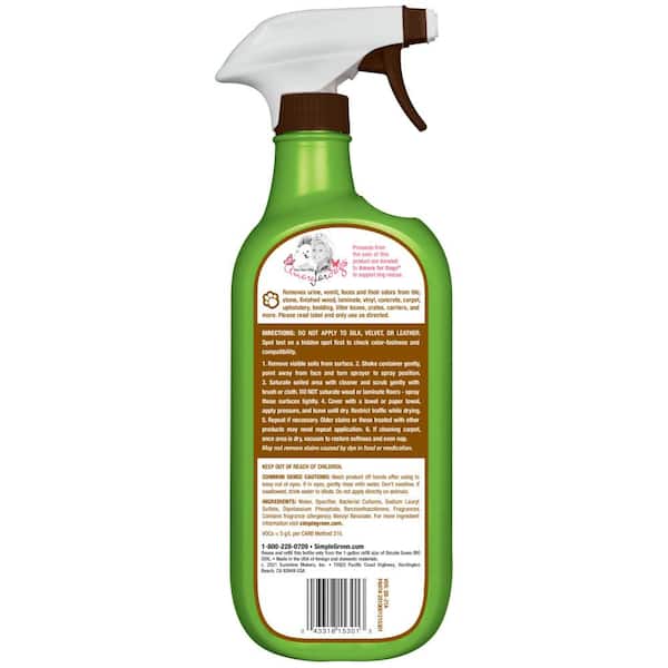 Simple Green Bio Dog Pet Stain and Odor Remover uses powerful natural enzymes to tackle tough soils and nasty pet smells. This ready-to-use formula breaks down urine, feces, vomit, dirt, and more, leaving behind a fresh, clean scent. The product penetrates porous surfaces, making it ideal for carpets, rugs, upholstery, bedding, and fabric. Can also be used on floors, crates, finished wood, and laminates. Odors are eliminated at the source, rather than just covered up, which discourages scent-based remarking. Optimized for use around pets.