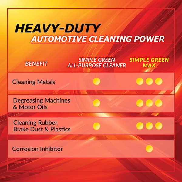 Simple Green MAX was developed with the auto enthusiast in mind. This heavy duty pro-strength automotive cleaner and degreaser was specifically formulated to handle your toughest cleaning jobs. Powers away oil, brake dust, grease, and grime. The non-abrasive formula is ideal for all types of vehicles, tools, equipment, garages and shops. Removes dirt, grease, tar, asphalt, mud, black streaks, transmission fluid, metal-working fluids, and more. Cleans a variety of surfaces without high-pH, harsh or hazardous caustic chemicals that can degrade surfaces and finishes.