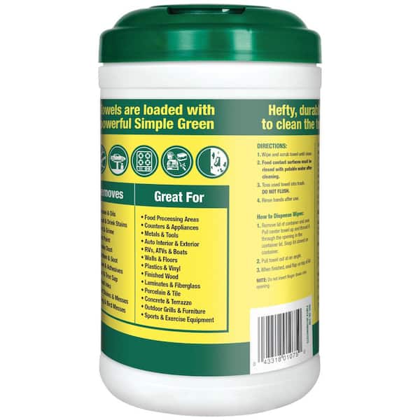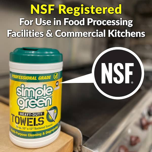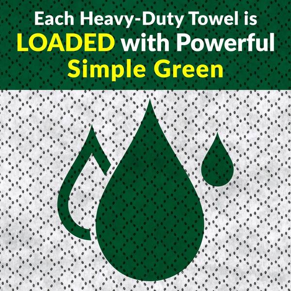 Simple Green Professional Grade Heavy-Duty Towels are designed specifically for larger, tougher messes. 4X stronger and 2X larger than our typical wipe, these heavy-duty multi-purpose towels are saturated with powerful Crystal Simple Green cleaner and degreaser. Durable wipes won’t break down when scrubbing and are NSF registered for use in commercial kitchens and food processing facilities. Wipes have excellent wicking and fluid holding capacity for handling liquid spills. Easily removes wet paint, inks, adhesive residue, scuff marks, and more from walls and floors. Use the heavy-duty wipes to remove grease, oil and brake dust from cars, tools and equipment. Non-abrasive and non-corrosive cleaning solution for delicate surfaces like sealed wood, stone, carpet or fabric.