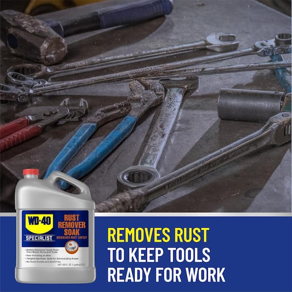 WD-40 Specialist Rust Remover Soak quickly dissolves rust and restores tools, equipment, and surfaces to bare metal without chipping, scraping or scrubbing. Great for removing rust from tools, metal, cast iron, chrome parts, and more without harming paint, gaskets, trim, or other surrounding parts. This rust-removal formula has no toxic fumes, does not use acids or caustic chemicals, is non-irritating to skin, and is safe to use on most metals. To remove light rust, leave parts in the solution for 1-3 hours. To remove heavy rust, leave parts in the rust removal solution overnight. Do not use on parts that have bluing, browning or protective oxide paints, as those protective coatings would be removed.