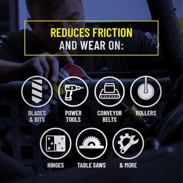 WD-40 Specialist Dry Lube is a dry lubricant that keeps your equipment running smoothly with long-lasting corrosion protection that does not attract dirt, dust, or oil. WD-40 Specialist Dry Lube provides superior lubrication and long-lasting corrosion protection with no oily residue. Best used where cleanliness and maximum performance are required as it dries quick leaving behind a lubricating film that resists dirt, dust and oil buildups. Great for reducing friction and wear on blades and bits, door and window tracks, slides, conveyor belts, rollers, hinges, table saws, lathes, power tools and equipment. Effective in temperatures ranging from -50 degree F to 500 degree F.