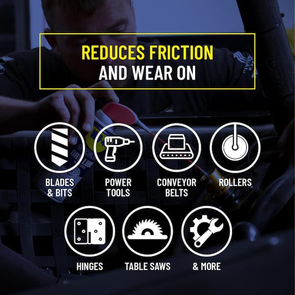 A dry lubricant that keeps your equipment running smoothly with long-lasting corrosion protection that does not attract dirt, dust, or oil. WD-40 Specialist Dry Lube with PTFE provides superior lubrication and long-lasting corrosion protection with no oily residue. Best used where cleanliness and maximum performance are required as it dries quick leaving behind a lubricating film that resists dirt, dust and oil buildups. Great for reducing friction and wear on blades and bits, door and window tracks, slides, conveyor belts, rollers, hinges, table saws, lathes, power tools and equipment. Effective in temperatures ranging from -50° F to 500° F.