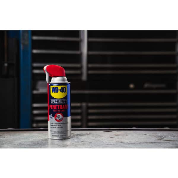 WD-40 Specialist Penetrant Fast-Acting low odor is a fast-acting penetrant with capillary action to penetrate deep into crevices, threads and seams to break the rust bonds that hold stuck parts together. WD-40 Specialist Penetrant Fast-Acting low odor formula works on contact to free rusted nuts, bolts, threads, locks, and chains leaving behind a protective layer that prevents rust and corrosion from re-forming. It is 50-state VOC compliant and safe to use on metal, rubber and plastic parts. Penetrates rust to free up stuck, frozen, or seized equipment and parts Safe to use on metal, rubber and plastic parts Ideal for use on nuts, bolts, threads and locks 50-state VOC compliant.