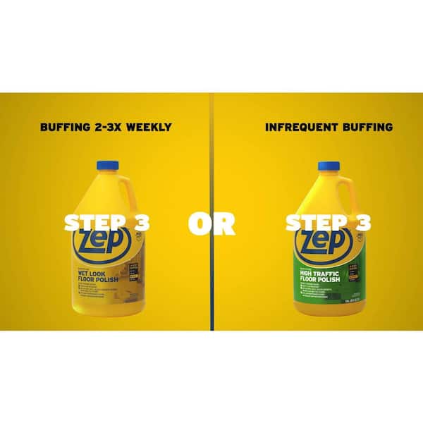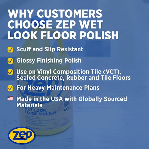 Give your floors a sophisticated look. ZEP Wet-Look Floor Polish is Step 3 of the 4-Step Pro Floor Maintenance System. Can be used as vinyl floor polish and is formulated to leave a long-lasting shine. This floor polish contains 19% solids and is designed to quickly dry into a high gloss. Formula works excellent as a concrete floor polish and also provides a wet-look coating for noticeable sheen in any space. It is durable enough to resist slips, scuffs and heel marks. The high speed burnishing brings out a brilliant shine.